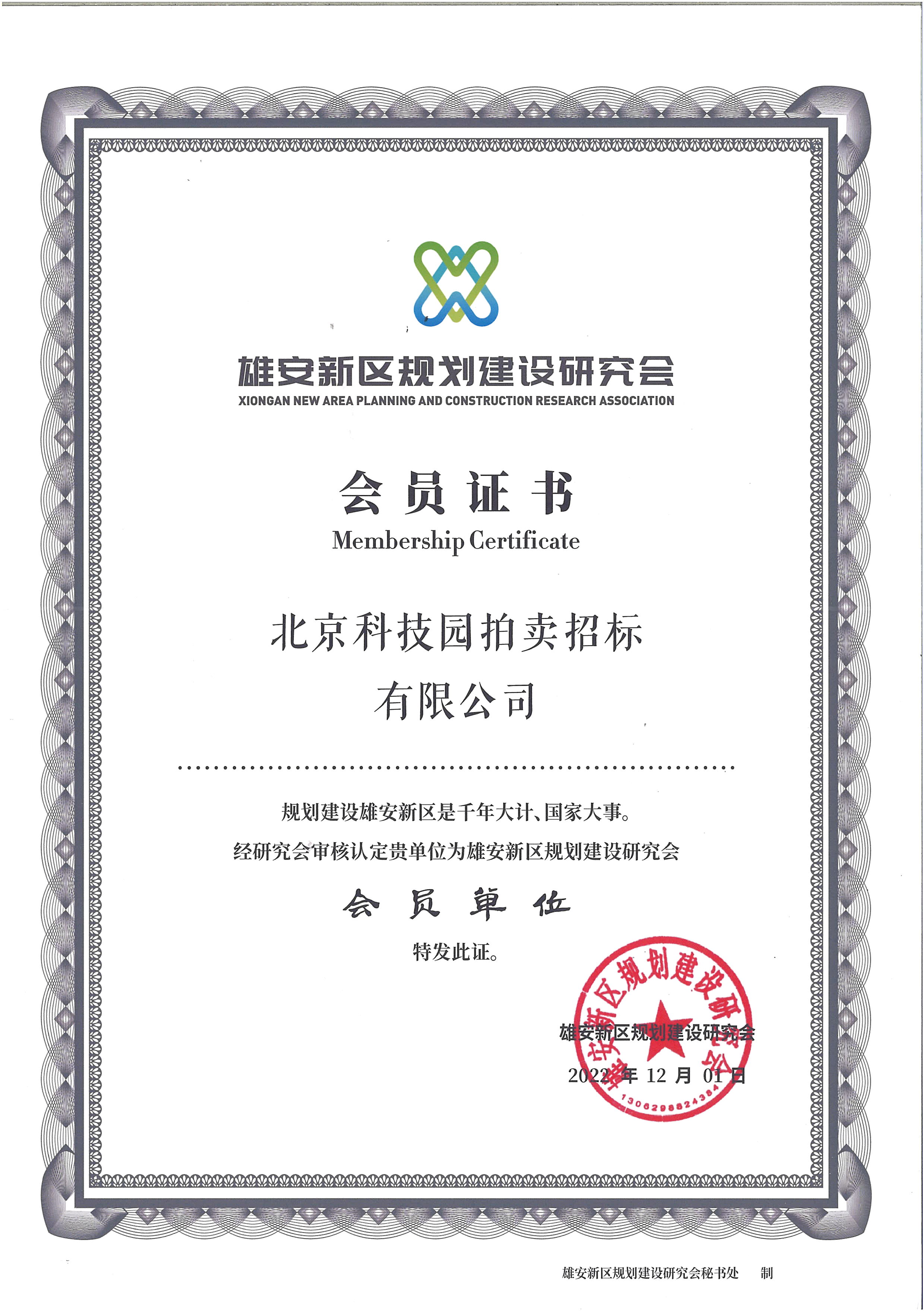 雄安新區(qū)規(guī)劃建設(shè)研究會會員證書