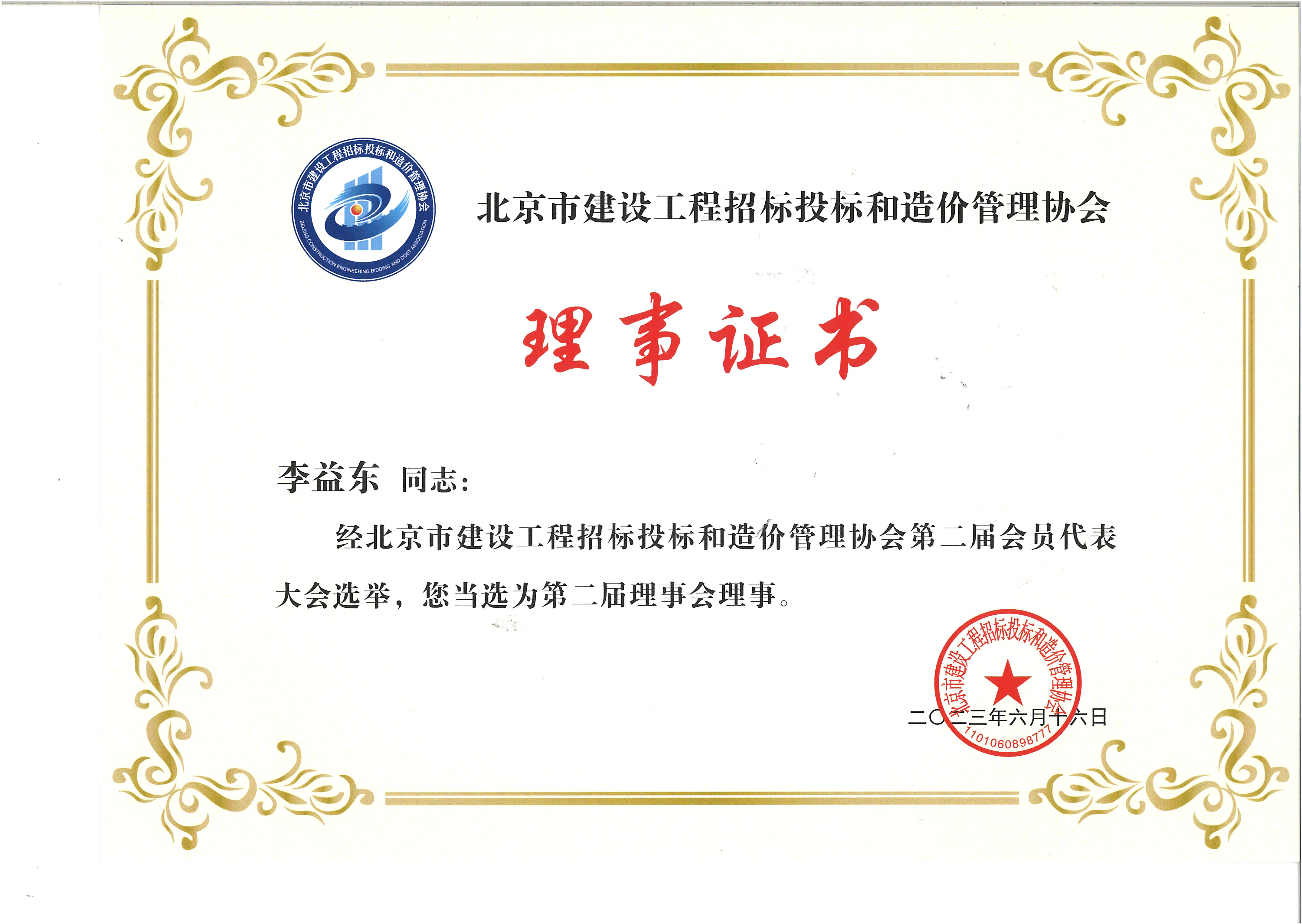 北京市建設(shè)工程招標(biāo)投標(biāo)和造價管理協(xié)會理事證書