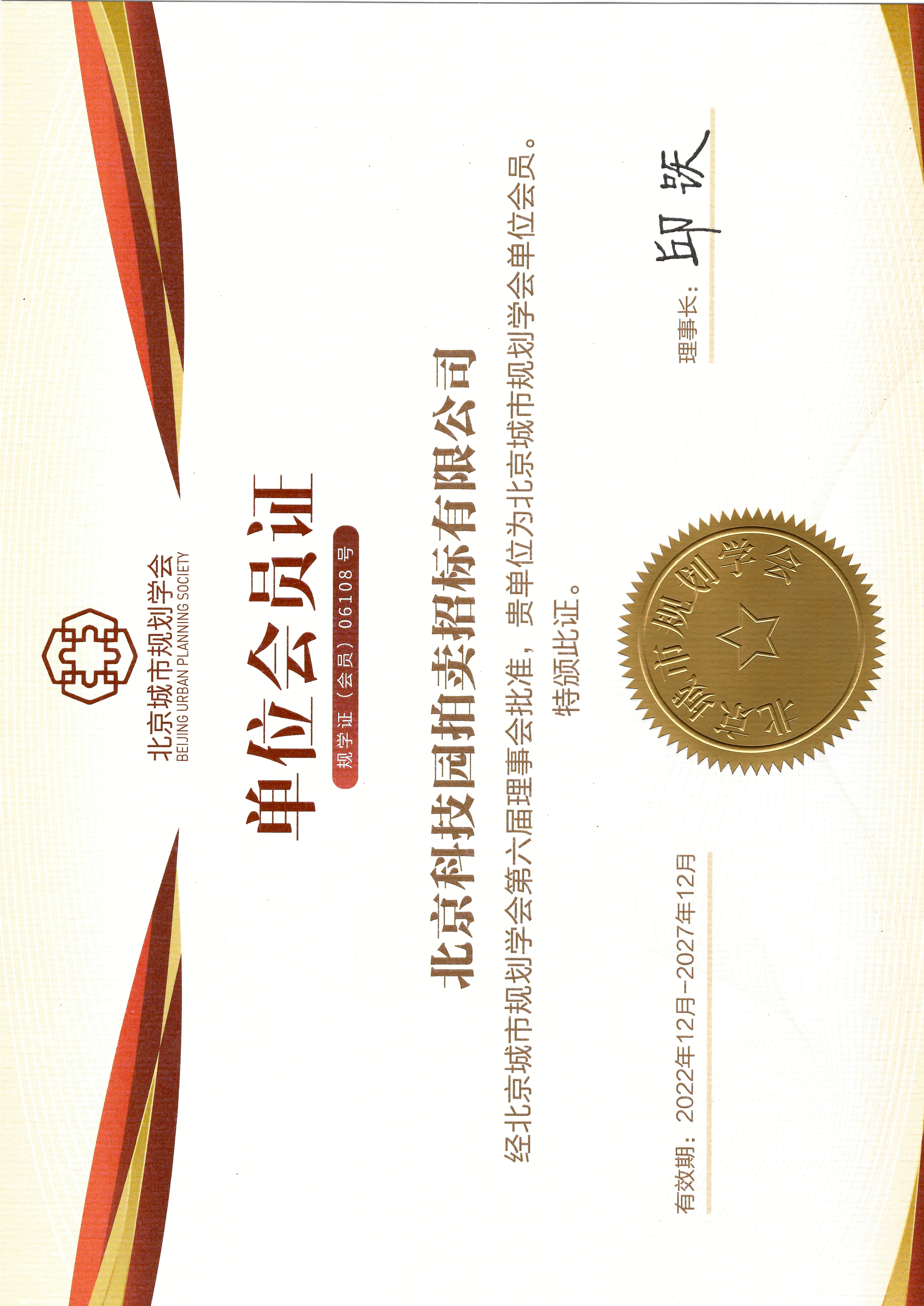 北京城市規(guī)劃學(xué)會單位會員證